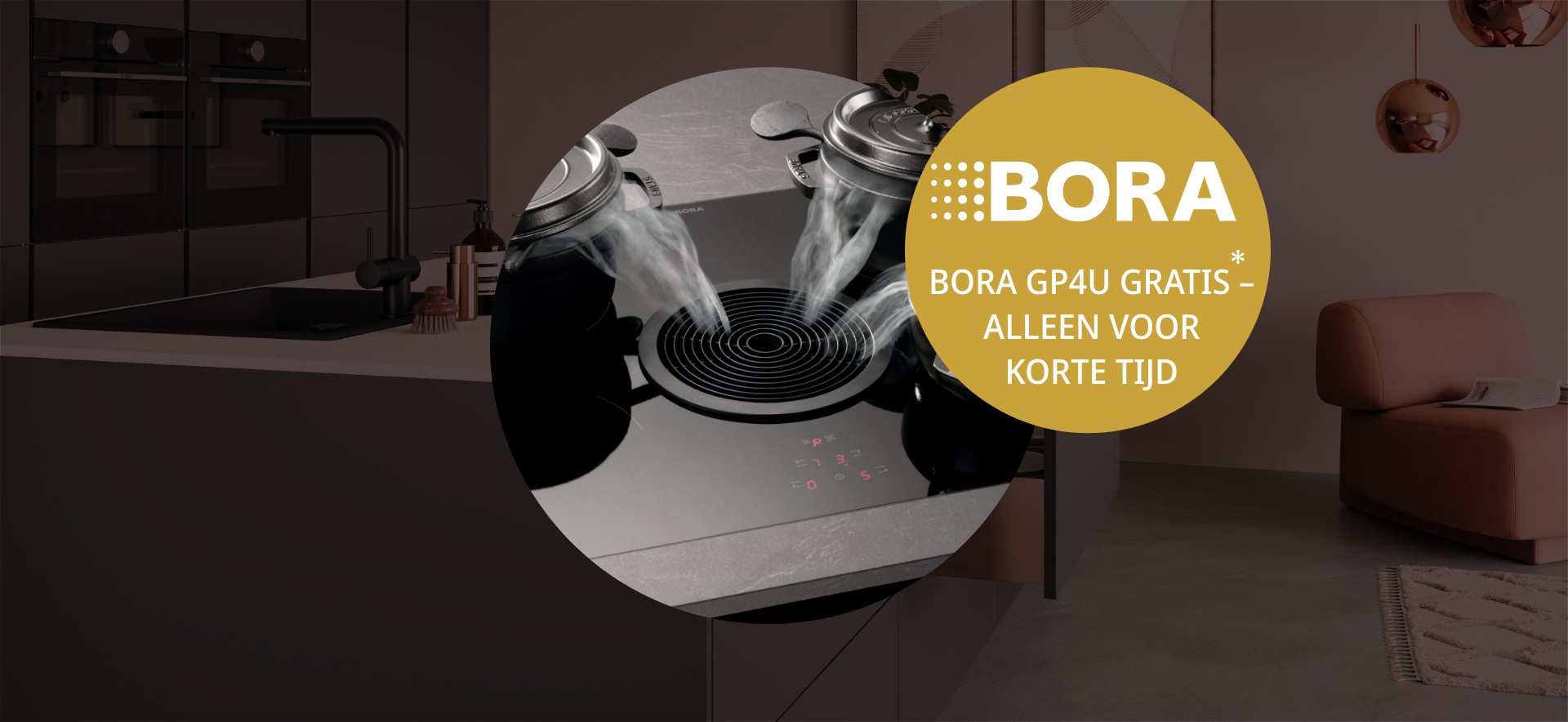 De unieke samenwerking met BORA biedt innovatieve high-end afzuigsystemen voor onze keukens. Exclusief bij ons: de BORA GP4 kookplaat met geïntegreerde afzuiging. Hiervoor is een op maat gemaakte kastoplossing ontworpen. Traditionele afzuigkappen zuigen de kookdamp klassiek naar boven af. Maar de revolutionaire BORA kookveldafzuiging zuigt de damp direct naar beneden bij de krachtige inductiekookplaat. De afzuiging en de vier grote kookzones kunnen worden bediend via het centrale bedieningspaneel. Het hoogwaardige systeem is effectiever dan traditionele afzuigkappen, daarnaast is het zeer stil en energiezuinig.